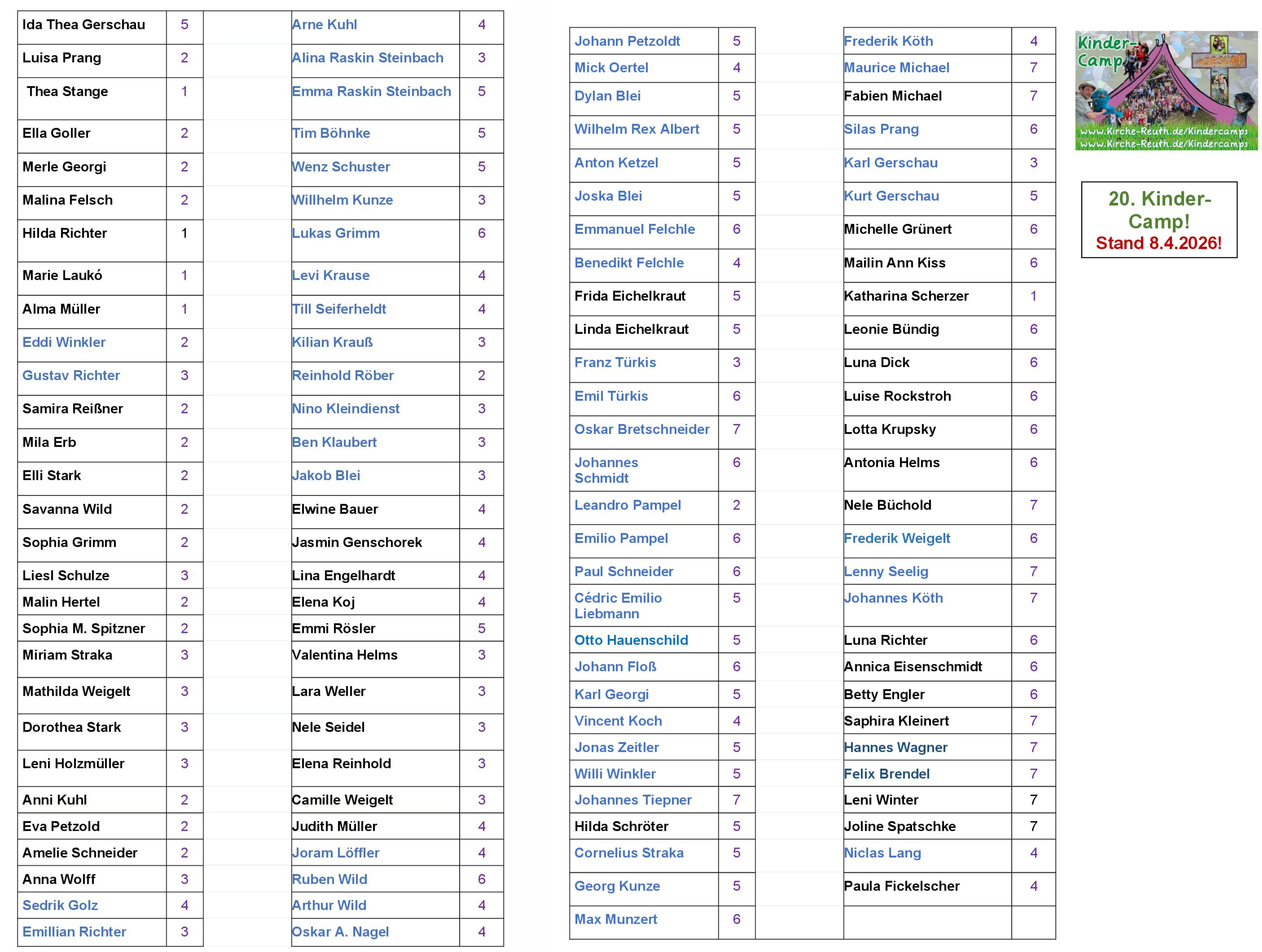 Bei den Kindercamps herrscht Ausnahmezustand auf dem Abenteuerspielplatz im Pfarrgarten, in der Holz-Jurte, auf der Camp-Wiese, im Winter-Kuhstall und im Pfarrhaus: Da gibt es 6 Tage volles Kindercamp-Programm für bis zu 150 Kinder von der 1. bis zu 7. Klasse. Etwas 50 meist ehrenamtliche und jugendliche Mitarbeiter engagieren sich dafür, dass die Kids ein attraktives Ferien-Event erleben dürfen. Für viele Kinder und Mitarbeiter waren die seit 2007 stattfindenden Kindercamps in Reuth auch ein prägendes Erlebnis auf ihrem Weg mit Gott. HIER ein cooler Clip vom Kinder-Camp 2024. Und HIER ein Clip vom Bau des Arche-Schuppens 2025. Das 20. Jubiläums-Kinder-Camp 2026 steigt wieder in der 2. Ferienwoche: vom 14. bis 19. Juli 2026! Stand 8.4.2026 sind bisher folgende 117 Teilnehmer angemeldet und habe eine Bestätigung bekommen. Anmelde-Formular für TEILNEHMER: Kinder 1. bis 7. Klasse (drauf klicken und die pdf runterladen, ausdrucken, ausfüllen und an Gemeindepädagoge Frank Stepper schicken!) Und wer als MITARBEITER mitmachen will, bitte hier das Mitarbeiter-Bewerbungs-Formular anklicken (ebenfalls pdf mit Anmeldeformular). Zwecks Urlaubsplanung bitte vormerken: Das Kinder-Camp 2027 wir NICHT in der 2. Ferienwoche sein, sondern in der 5. Woche der Sachsen-Sommerferien: 10.-15. August 2027!! Die schönsten Bilder aller Camps sind hier: 19. Kindercamp 2025 ; 18. Kindercamp 2024 ; 17. Kindercamp 2023 ; 16. Kindercamp 2022 ; 15. Kindercamp 2021 ; 14. Kindercamp 2020 ; 13. Kindercamp 2019 ; 12. Kindercamp 2018 ; 11. Kindercamp 2017 ; 10. Kindercamp 2016 ; 9. Kindercamp 2015 ; 8. Kindercamp 2014 ; 7. Kindercamp 2013 ; 6. Kindercamp 2012 ; 5. Kindercamp 2011 ; 4. Kindercamp 2010 ; 3. Kindercamp 2009 ; 2. Kindercamp 2008 ; . Kindercamp 2007