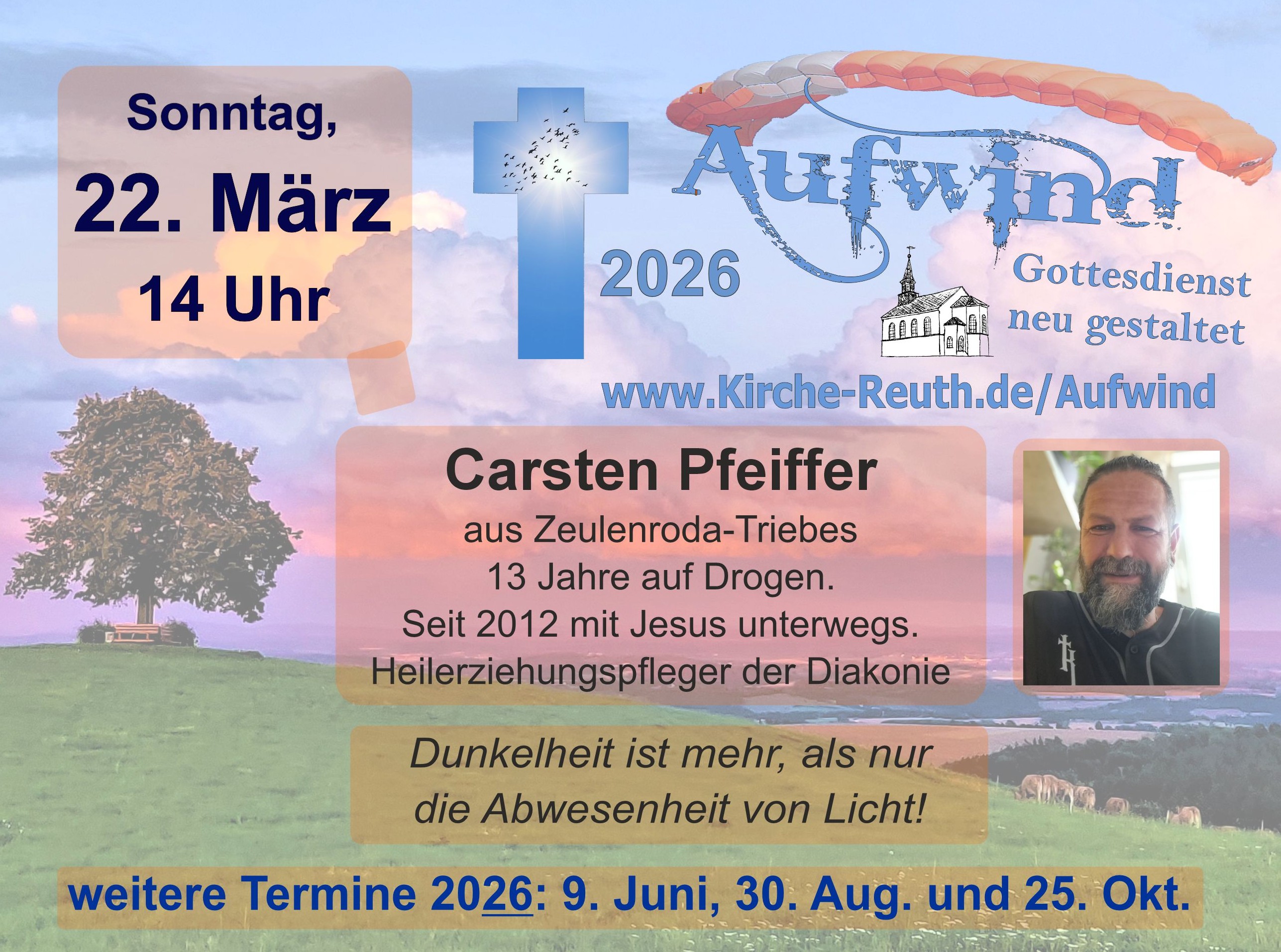 Die Aufwind-Gottesdienste gibt es seit 2011 in der Kirche in Reuth etwa 4 mal pro Jahr als besondere Gottesdienste, zu dem immer ein besonderer Gastsprecher eingeladen wird. Die vom Hauskreis junger Erwachsener ausgestalteten Aufwind-Gottesdienste beginnen immer um 14.00 Uhr an einem Sonntag. Im Anschluss ist jeder zum Kaffeetrinken in die Holz-Jurte bzw. in den Pfarrgarten eingeladen. Clip vom 31.8.2025 HIER können Sie als mp3 die Aufwind-Predigten anhören von folgenden Gastsprechern: Guine Anderson, Ervin Dräger, Pfr. Christian Colditz, Baptist Deuber, Sonja Neidhardt, Frieder Jäckel, Gabriele Hohmuth, Theo Tolsma, Kai Stecher, Frank Stepper, Jens Werner, Dr. Hans-Joachim Schütt, Dr. Christa-Maria Steinberg, Hanjo Butz, Dieter Leicht, Elke Wonsiedler, Thilo Blei, Ulike Pentzold, Wolfgang Kuhs, Pfr. Sandro Göpfert, Andreas Riedel, David Strauss, Steffen Golle, Jens Müller (Illus), Anja Georgi, Pfr. und Autor Gunther Geipel,Sportmissionar Thomas Seidel, Karl-Heinz Vanheiden, Torsten Hartung, Gerd Kämpf, Manni Sauerbrei, Bernhard und Carola Wölfl, Andreas Riedel, Renee Rock, Bernd Erdmann, Andreas Weber, Bernd Hüttner, Nächster AUFWIND-Gottesdienst in Reuth ist am So., 22. März 2026. Special Guest ist Carsten Pfeiffer aus Zeulenroda-Triebes (siehe Flyer) Weitere AUFWIND-Gottesdienst-Termine iun 2026 (jeweils So., 14 Uhr): 9. Juni, 20. August und 25. Okt.