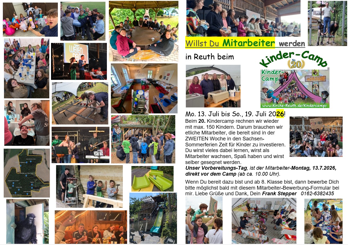 Bei den Kindercamps herrscht Ausnahmezustand auf dem Abenteuerspielplatz im Pfarrgarten, in der Holz-Jurte, auf der Camp-Wiese, im Winter-Kuhstall und im Pfarrhaus: Da gibt es 6 Tage volles Kindercamp-Programm für bis zu 150 Kinder von der 1. bis zu 7. Klasse. Etwas 50 meist ehrenamtliche und jugendliche Mitarbeiter engagieren sich dafür, dass die Kids ein attraktives Ferien-Event erleben dürfen. Für viele Kinder und Mitarbeiter waren die seit 2007 stattfindenden Kindercamps in Reuth auch ein prägendes Erlebnis auf ihrem Weg mit Gott. HIER ein cooler Clip vom Kinder-Camp 2024. Das 20. Jubiläums-Kinder-Camp 2026 steigt wieder in der 2. Ferienwoche: vom 14. bis 19. Juli 2026. Tipp: Termin unbedingt freihalten und ab sofort ist die Anmeldung hier möglich: Anmelde-Formular für TEILNEHMER: Kinder 1. bis 7. Klasse (drauf klicken und die pdf runterladen, ausdrucken, ausfüllen und an Gemeindepädagoge Frank Stepper schicken!) Und wer als MITARBEITER mitmachen will, bitte hier das Mitarbeiter-Bewerbungs-Formular anklicken (ebenfalls pdf mit Anmeldeformular). Die schönsten Bilder aller Camps sind hier: 19. Kindercamp 2025 ; 18. Kindercamp 2024 ; 17. Kindercamp 2023 ; 16. Kindercamp 2022 ; 15. Kindercamp 2021 ; 14. Kindercamp 2020 ; 13. Kindercamp 2019 ; 12. Kindercamp 2018 ; 11. Kindercamp 2017 ; 10. Kindercamp 2016 ; 9. Kindercamp 2015 ; 8. Kindercamp 2014 ; 7. Kindercamp 2013 ; 6. Kindercamp 2012 ; 5. Kindercamp 2011 ; 4. Kindercamp 2010 ; 3. Kindercamp 2009 ; 2. Kindercamp 2008 ; . Kindercamp 2007