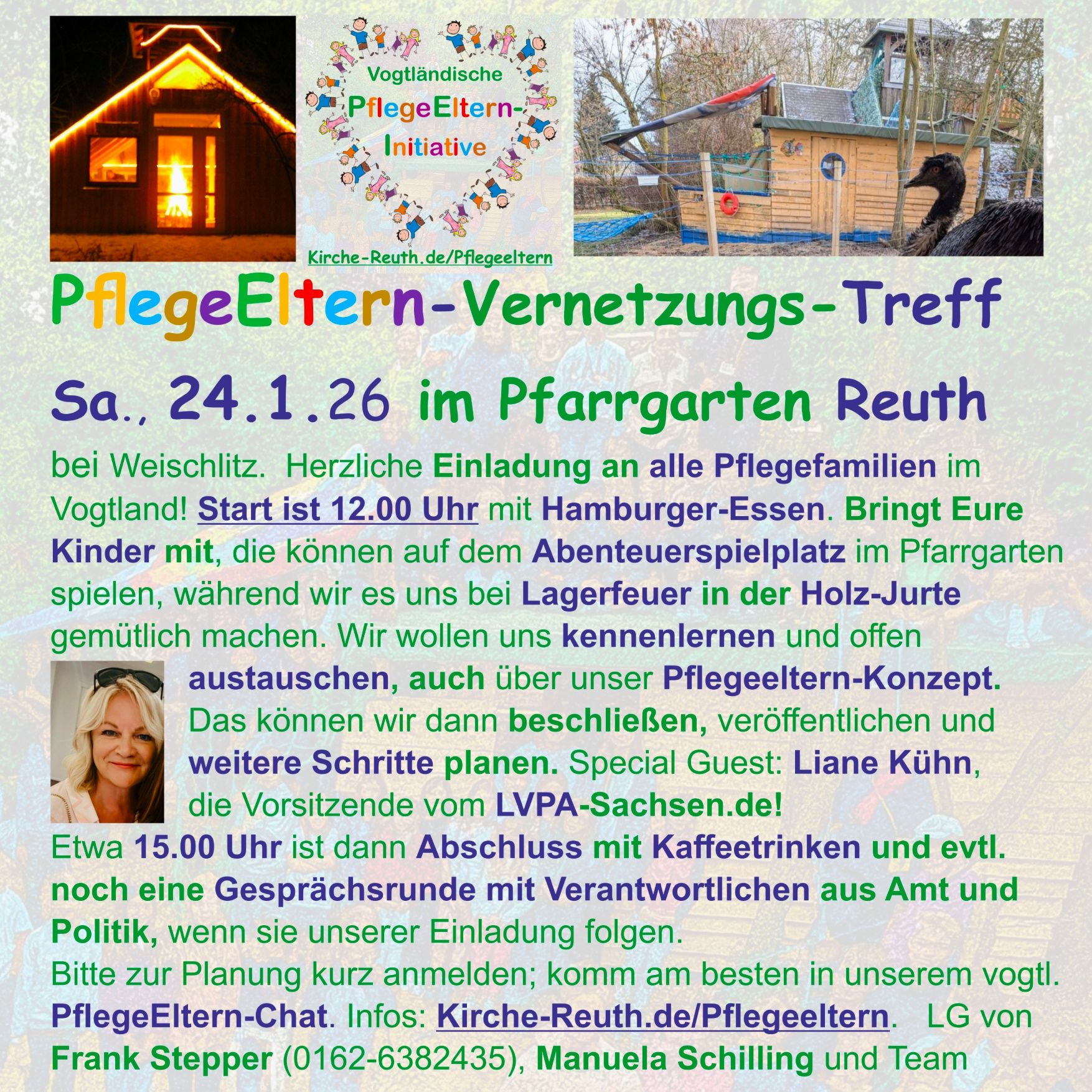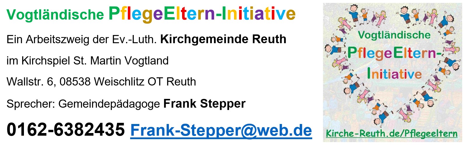 Neu: Vogtländische PflegeEltern-Initiative! Gemeinsam für die Vernetzung, Ermutigung, Stärkung und Interessenvertretung von Pflegefamilien im Vogtlandkreis! Gerne kannst Du mitmachen!: => Wir haben ein KONZEPT erstellt zur "Neugewinnung und Stärkung von Pflegeeltern im Vogtlandkreis" (HIER als Korrektur-Entwurf). Es analysiert auf 22 Seiten die Situation von Pflegefamilien im Vogtlandkreis und macht 23 Vorschläge, wie unsere Situation verbessert werden kann, und der Vogtlandkreis nebenbei noch Kosten für Heimerziehung spart. Gerne bauen wir Deine Ideen zur Verbesserung der Pflegefamilien-Situation in das Konzept mit ein. Nach Ansicht des Jugendamtes enthält der obige Korrektur-Entwurf des Konzeptes zwar gute Ansätze aber noch viele sachliche und juristische Mängel. Das Angebot, in einem Gesprächprozess daraus ein gemeinsames Konzept zu erarbeiten haben wir am 20.1.2026 angenommen. => Herzliche Einladung in die CHAT-GRUPPE unserer PflegeEltern-Initiative. Wir sind ein vom Jugendamt unabhängiges Netzwerk auch zur Interessenvertretung. Je mehr mitmachen, desto stärker wird unsere Stimme! => Am Samstag, den 24.1.2025 laden wir herzlich ab 12 Uhr ein, zu einem PflegeEltern-Vernetzungs-Treffen auf dem Abenteuerspielplatz im Pfarrgarten Reuth. Ein Kennlern- und Austauschtreffen für Pflegeeltern bei Lagerfeuer in der Holz-Jurte. Die Kinder können derweil unseren Abenteuerspielplatz nutzen. Bei diesem Treffen wollen wir auch über das o.g. Pflegeeltern-Konzept sprechen und abstimmen und dann damit als Vogtländische PflegeEltern-Initiative an die Öffentlichkeit gehen. => Zu Himmelfahrt am 14.5.26 planen wir einen vogtländischen Pflegefamilien-Ermutigungs-Tag, ebenfalls auf dem Abenteuerspielplatz im Pfarrgarten Reuth. Wir planen weitere Treffen z.T. mit kompetenten externen Gästen auch in anderen Teilen des Vogtlands. Wenn Du Interesse hast, Dich in unserem vogtländischen PflegeEltern-CHAT zu vernetzen und aktuelle Infos zu bekommen, wenn Du unsere Stimme und unsere Vorschläge für die Stärkung von Pflegefamilen unterstützen willst, oder wenn Du ein offenes Ohr für Deine Erfahrungen und Probleme als Pflegeeltern im Vogtlandkreis suchst, kannst Du Dich gerne bei uns melden, oder bei Dir bekannten Pflegeeltern, die bereits mit uns vernetzt sind. Frank Stepper (Gemeindepädagoge, Lehrer und ehrenamtlicher Vormund)