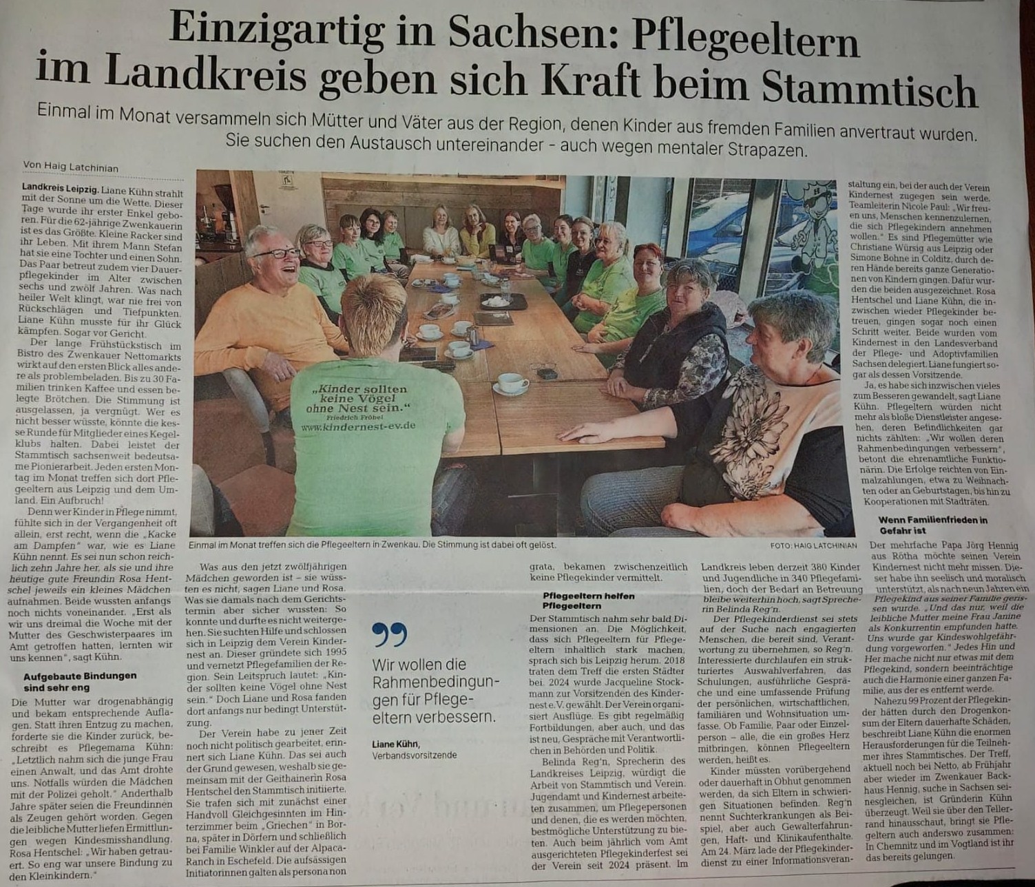 Als Vogtländische PflegeEltern-Initiative sind wir u.a. vernetzt mit: => Landesverband der Pflege- und Adoptiveltern in Sachsen e.V. (Da sind wir Mitglied; Liane Kühn begleitet uns) => Ev. Kirchgemeinde Reuth (da sind wir seit 12-2025 offiziell ein Arbeitszweig; so wie auch unsere Kinder-Camps) => Lebenshaus e.V. in Lichtenstein (davon träumen nicht nur wir im Vogtland und würden gerne Mitarbeiter einladen ...) => Selbstvertretung der Pflegefamilien (Manuela Schilling ist da eine von 6 Landessprechrinnen) => Initiativgruppe für Pflege- und Adoptivkinder in Falkenstein (gibt es seit 30 Jahren und ist bei uns mit dabei) => KINDERnest e.V. Leipzig Land mit seinem Pflegeeltern-Stammtisch und Liane Kühn (s.o.) sind uns auch ein Vorbild! => ... P.S.: Weitere PflegeEltern-Vernetzungstreffen sind in Planung (Ziel: 2-4 pro Jahr). Infos folgen. Wir würden am liebsten gemeinsam mit dem Jugendamt alle ca. 180 Pflegefamilien zu einem Pflegefamilien-Treffen in die Mitte des Vogtlands (z.B. nach Eich) einladen. Aufgrund von Terminüberschneidungen wird es zu Himmelfahrt doch kein PflegeEltern-Treffen in Reuth geben. ... Aktuelle Infos gibt im PflegeEltern-Chat .... |